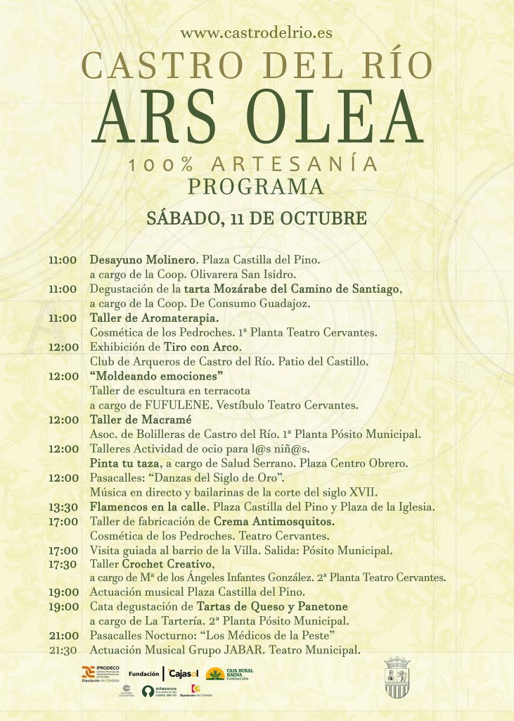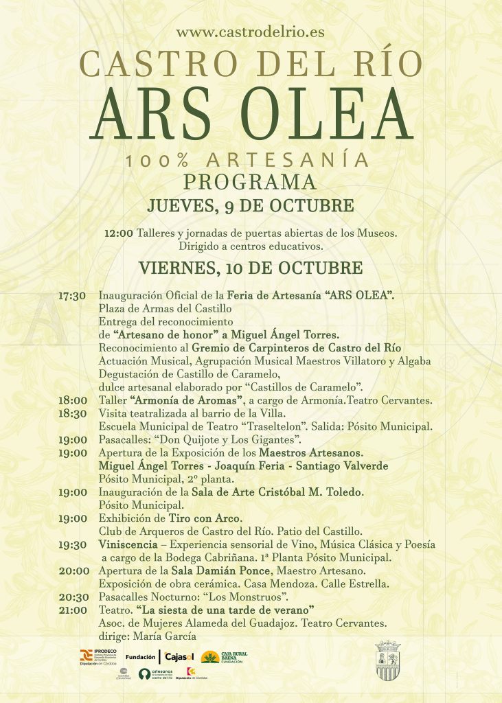 Estas jornadas están organizadas por el Ayuntamiento de Castro del Río, dentro del marco de ARS OLEA, con el patrocinio de IPRODECO, Fundación Cajasol, Patronato de Turismo de Códoba y Fundación Caja Rural de Baena, y la colaboración de la Junta de Andalucía, Universidad de Córdoba y Diputación de Córdoba, con el objetivo es contribuir al crecimiento económico, al desarrollo profesional y al mantenimiento de nuestro patrimonio cultural.